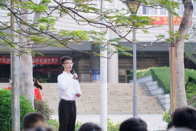 在国旗下,电子商务专业2019级的彭海涛带来了题为《传承发扬五四精神 争做新时代电商人》的演讲。他提到,作为新时代的电商学子,应当努力钻研专业知识,结合所学与当下时代背景,秉承新时代“五四精神”,为巩固脱贫攻坚成果、实现乡村振兴贡献力量。