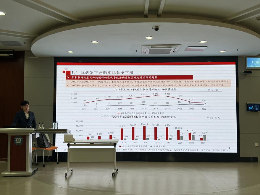 讲座分为两个模块。在第一个模块中,吴睿向同学们讲授全面注册制下企业并购发展趋势及案例解析。他指出,在全面注册制下,企业并购重组数量下滑,但国企改革推进和证券化率提升。企业需要更加注重自身的核心竞争力和战略定位,以便更好地适应市场的变化和发展趋势。同时,也需要更加注重合规和风险控制,以避免出现不必要的法律和经济风险。他介绍了一些常见的上市公司并购重组模式,并通过一些具体的案例进行了解析,有助于帮助同学们更好地理解并购重组的实际操作和应用。