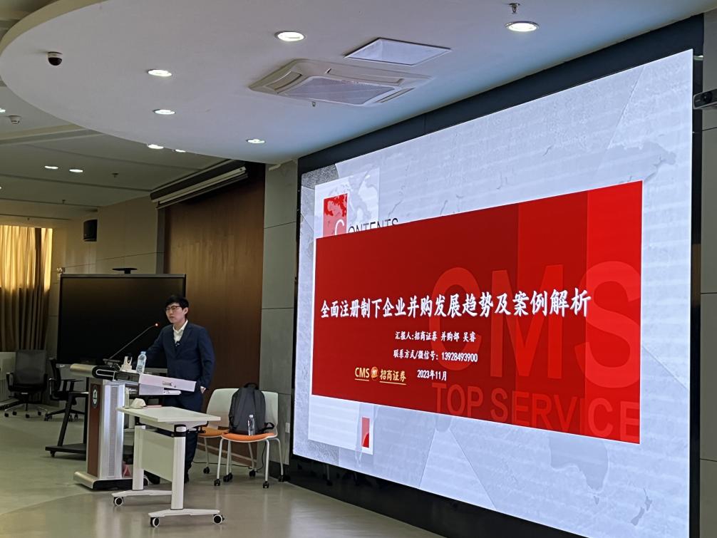 2023年11月16日,招商证券在新葡京博彩官网 四楼报告厅开展了《全面注册制下上市公司并购发展趋势及案例解析投行分析师工作内容介绍》课程,本次课程是暨南大学、中国证监会深圳监管局、深圳证券交易所、招商证券合作共建的《资本市场实践》系列课程第七堂课。本次讲座由招商证券并购部吴睿授课,校区内110名金融科技专业硕士生参与。