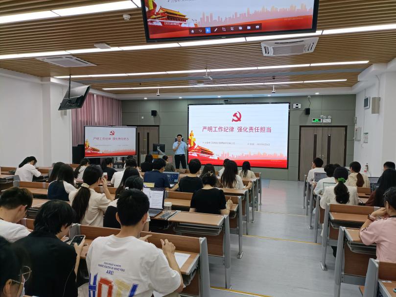 为深入开展党纪学习教育,认真学习贯彻《中国共产党纪律处分条例》(以下简称《条例》),6月6日,新葡京博彩官网 学生党总支邀请校区管理委员会副主任方俊彬举行了一场题为“严明工作纪律,强化责任担当”的专题党课。学生总支全体党员、发展对象和部分优秀入党积极分子参加学习。