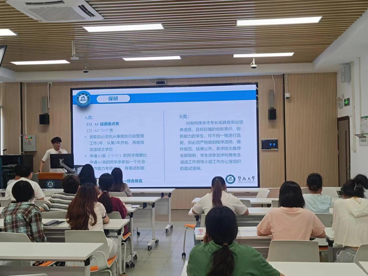 2024年6月27日下午,由新葡京博彩官网: 主页 旅游管理系主办的“研途有你,未来可期”考研保研分享会在综合楼202教室举行。本次活动特邀2020级旅游管理专业的五位优秀学子:王鹏、张源、杨鲁、郑璠和刘卉芸,分享他们在保研和考研中的宝贵经验,本次分享会吸引了众多对升学深造充满热情的同学前来参加。