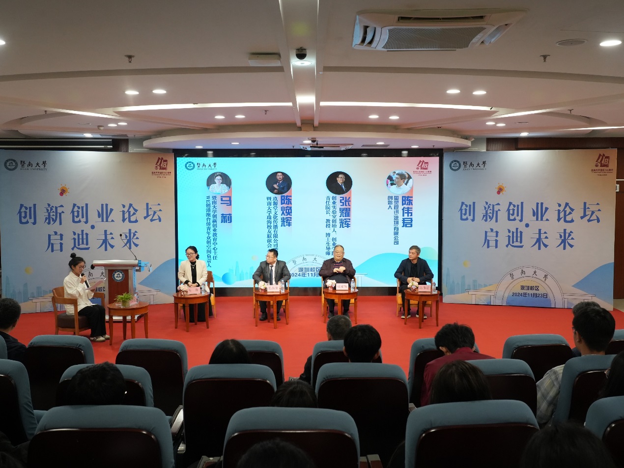 开幕式后,论坛围绕:如何开展学生创新创业教育、激发学生创新意识、为学生未来创业之路提供建议等主题,举办圆桌会议。张耀辉,马莉,陈焕辉及陈伟君做主题发言。他们先后分享了自己的学习和创业经历,强调了努力学习、拓宽眼界、持续探索的重要性,鼓励同学们在困境中寻找契机,勇于面对各种挑战,努力实现自己的人生目标。