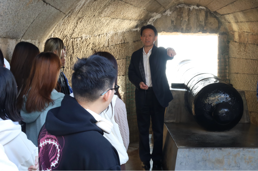 走出博物馆,师生们来到威远炮台旧址参观。在参观过程中,林晓灵充分结合鸦片战争的历史和港澳台侨学生的特点,进行了一场别开生面的现场教学。在历史知识讲述与互动中,他带领同学们回顾了近代以来香港与澳门所经历的屈辱历史,全面梳理港澳地区的历史脉络,理解其背后的复杂背景与深远影响,激发同学们强烈的爱国情怀,进一步坚定大家报效祖国的信心。