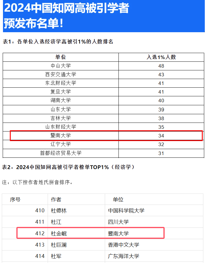 近日,中国知网下属的中国科学文献计量评价研究中心发布了“2024中国知网高被引学者”名单(链接指引://mp.weixin.qq.com/s/3m-jhiGw467puHMwUMyfUw),暨南大学2024中国知网高被引学者榜单TOP1%(经济学)入选34人,全国排名22,其中金融科技学科带头人杜金岷教授位列其中,彰显了暨南大学相关学科专业的影响力。