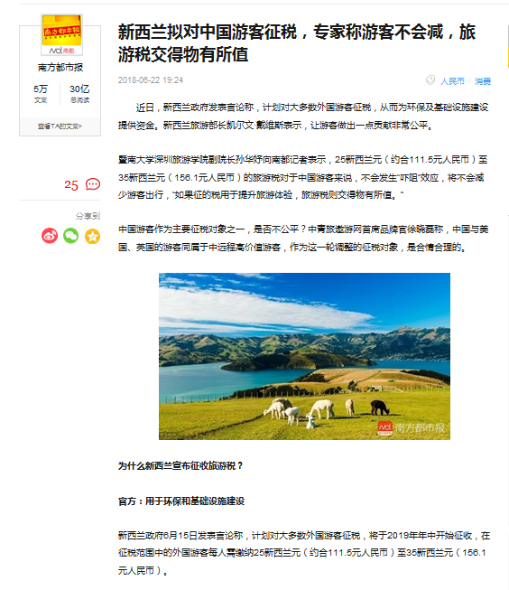 新西兰拟对中国游客征税,专家称游客不会减,旅游税交得物有所值